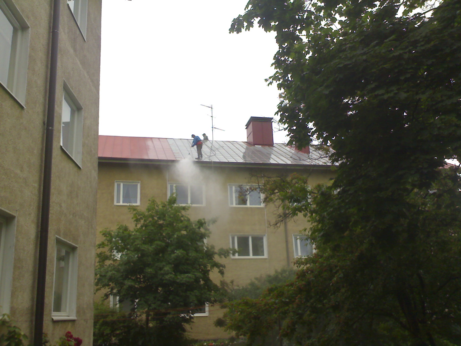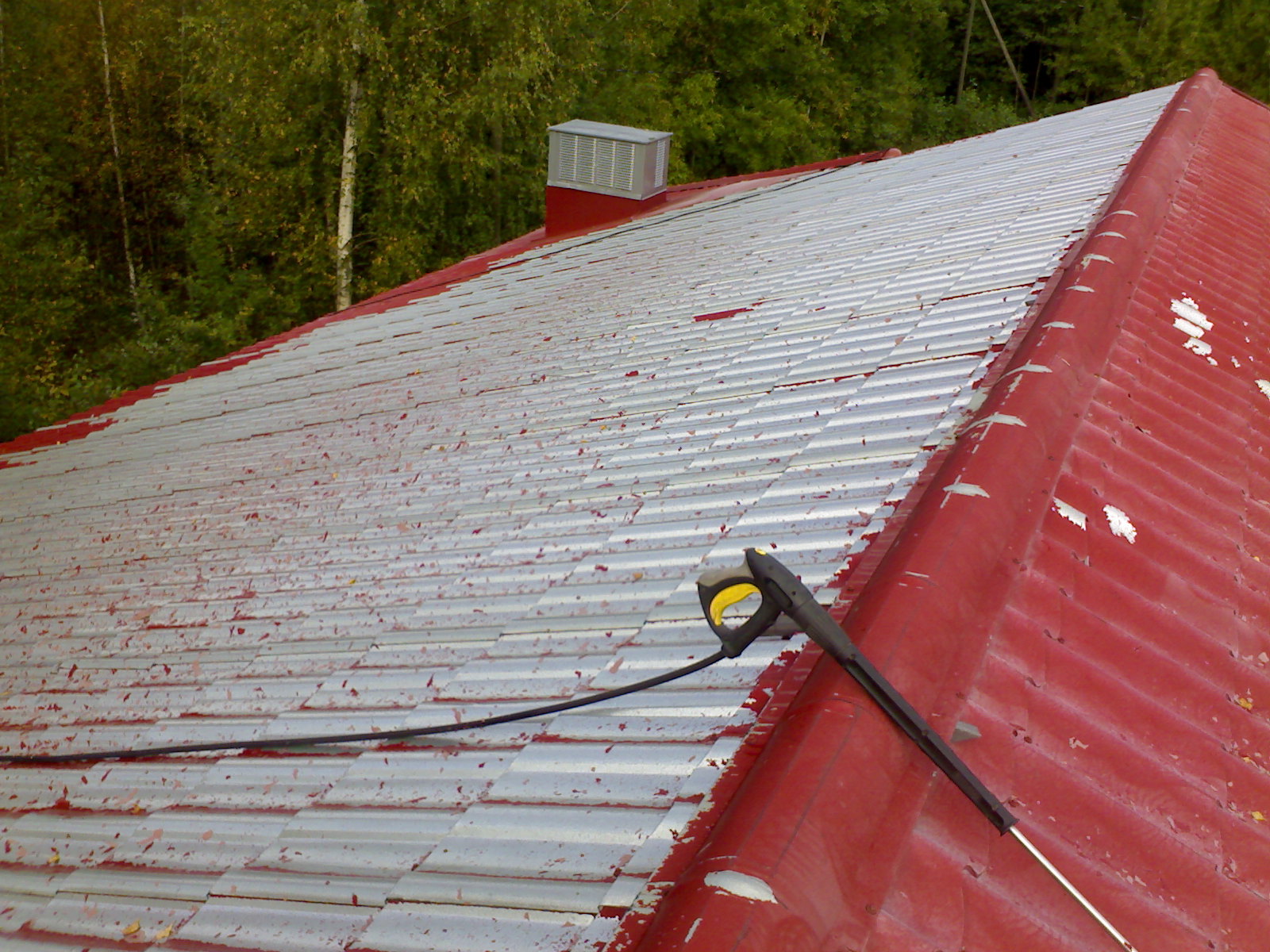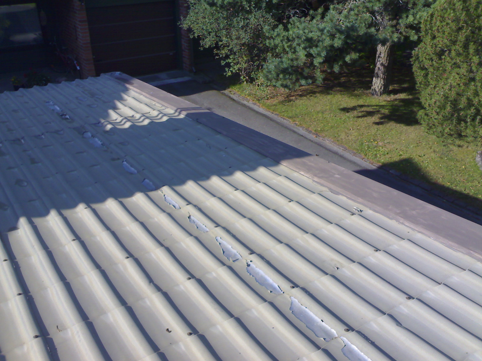 Yläkuvassa uudelleen pinnoitettu muovipinnotteinen peltikatto. Vanhoissa, tehdaspinnotteisissa katoissa esiintyy usein muovipinnoitteen irtoamista ja värivaurioita. NOXYDE -pinnoitus on paras ratkaisu tehdaspinnoitteisille ( esim.PVC-pinnat, Pural, PVDF ) peltikatoille. Tavalliset aineet eivät sovellu lainkaan tehdaspinnoitteisille katoille: väärä ainevalinta ja työtekniikka johtaa uuteen käsittelyyn 5-10 vuoden sisällä. Uusintakäsittely onkin sitten kalliimpi isompien pohjatöiden vuoksi.